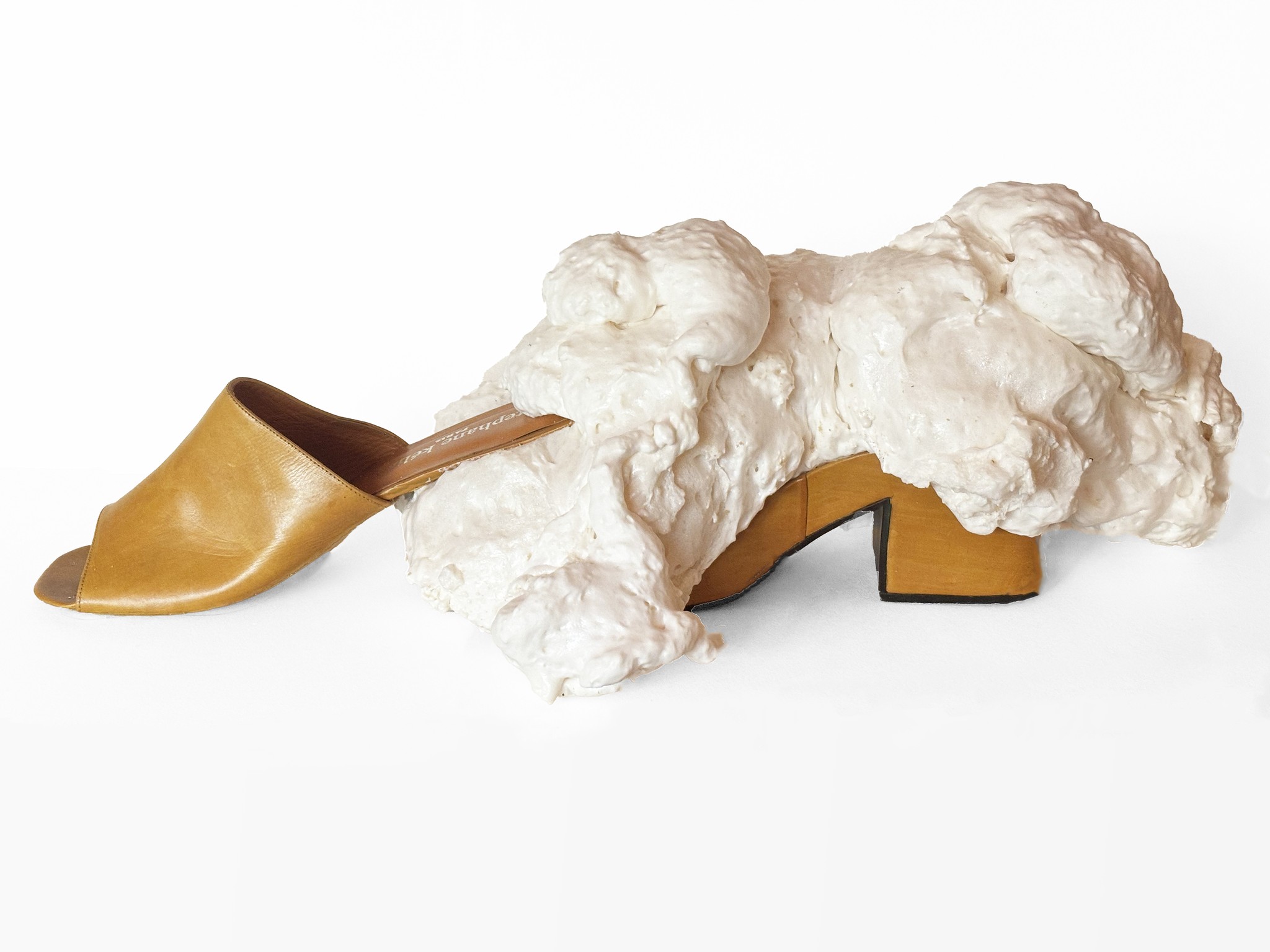 Christine Clinckx, Overgelopen schoenen, 2024, shoes , emulsion and Christine Clinckx, Wedding Shoes, 2000, chewing gum, oil paint , wedding shoes